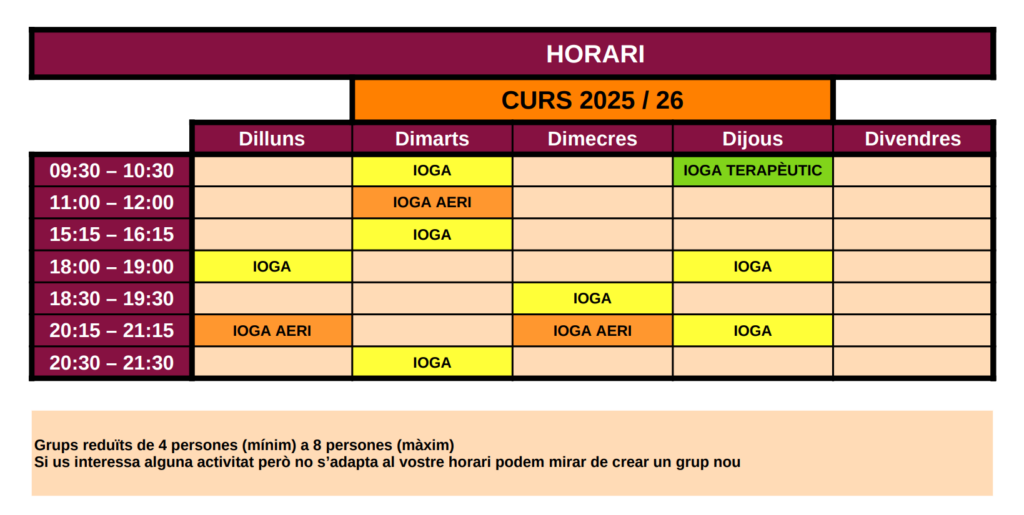 Per tal de poder tenir la màxima atenció personalitzada en els alumnes, les classes de Ioga Aeri tenen un límit de 6 persones.